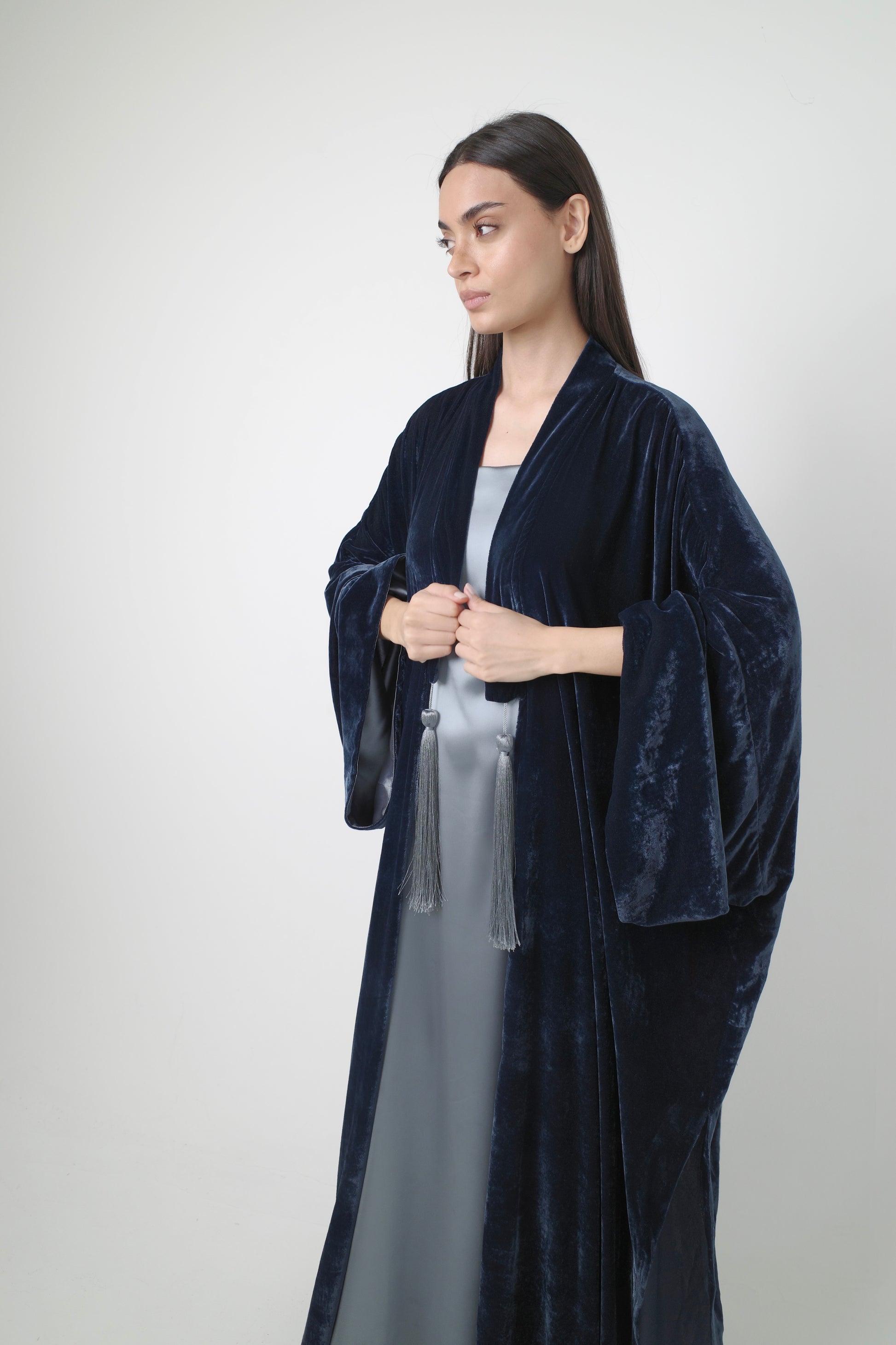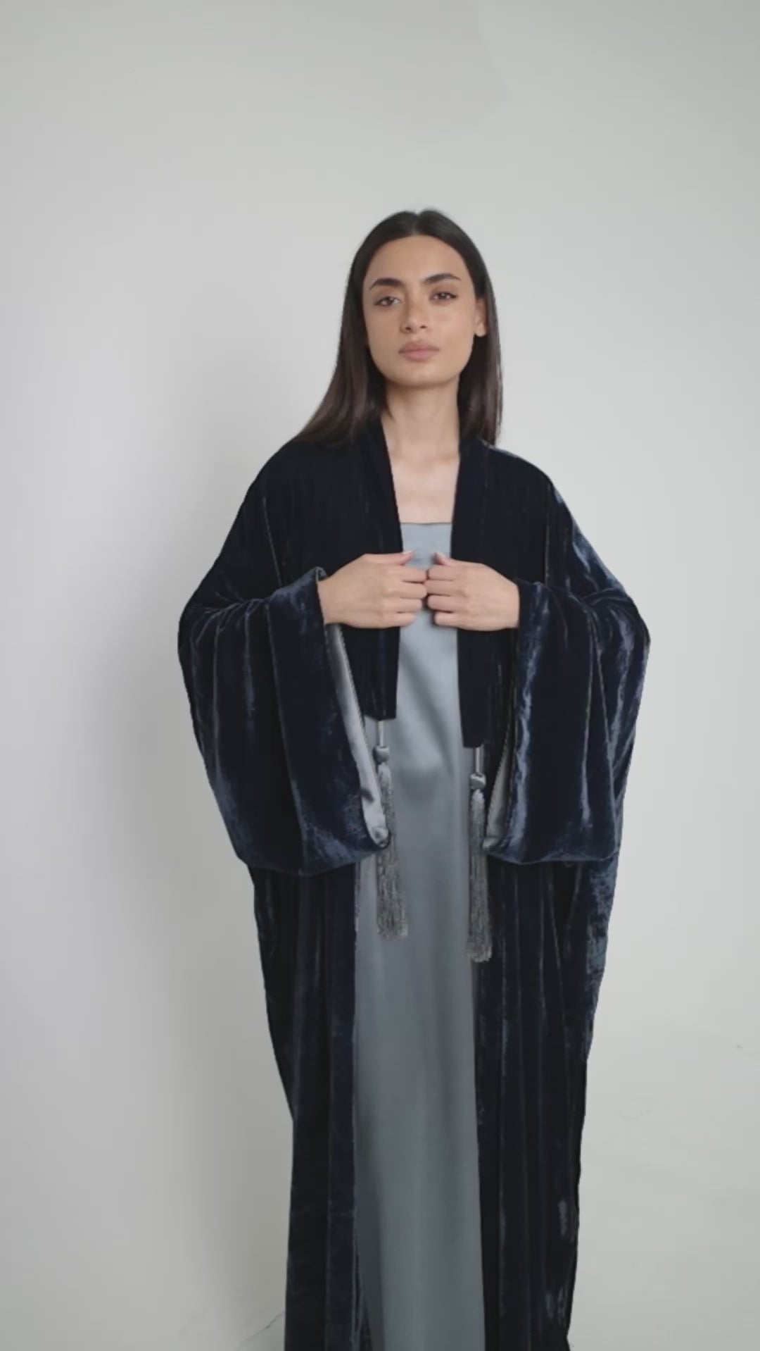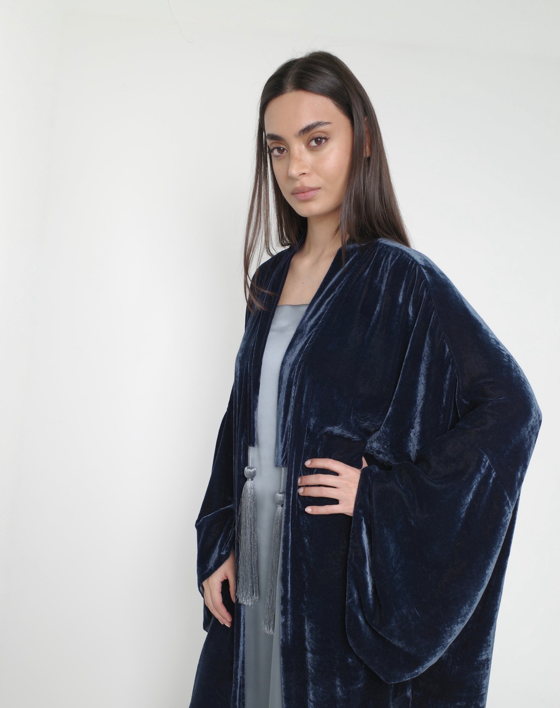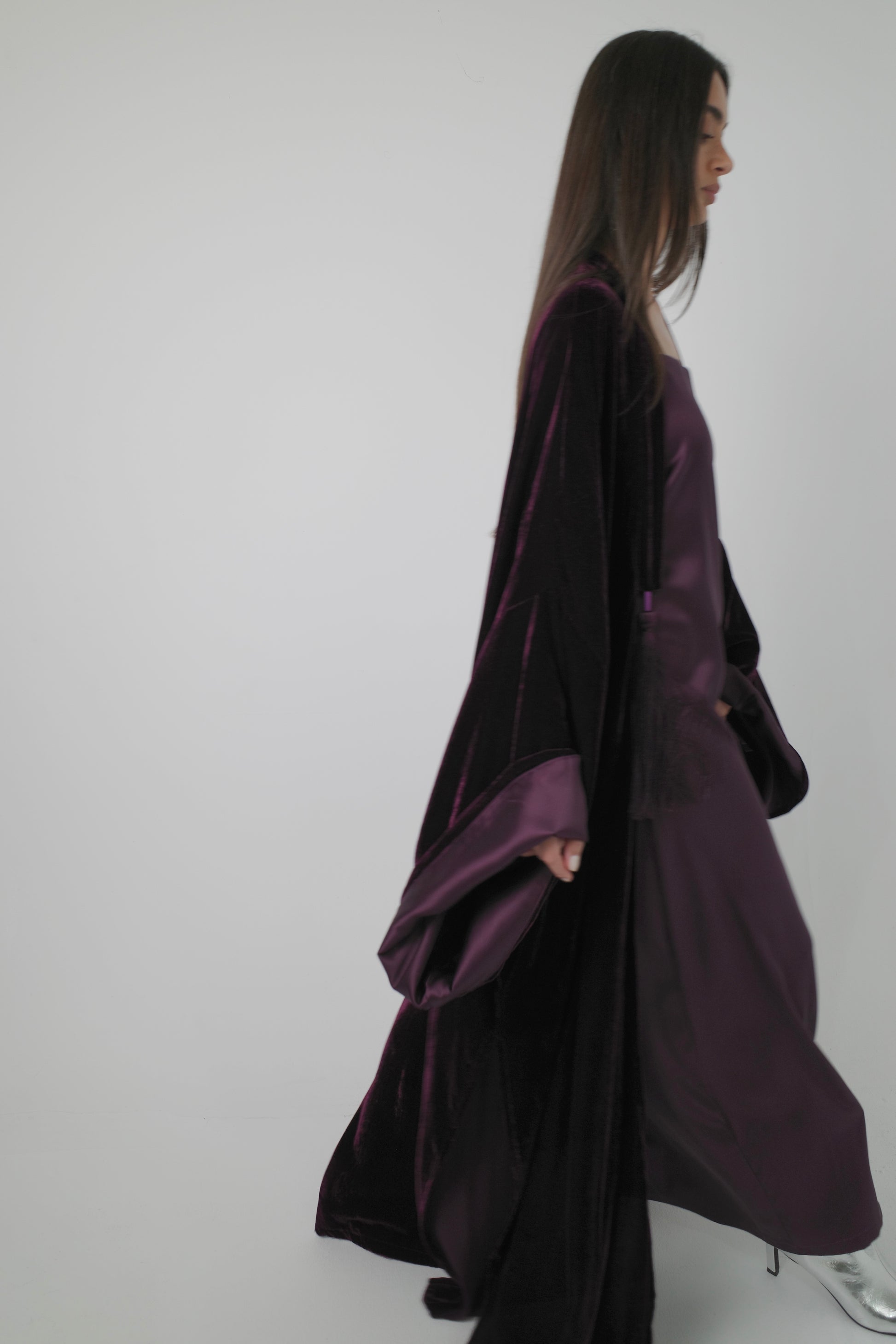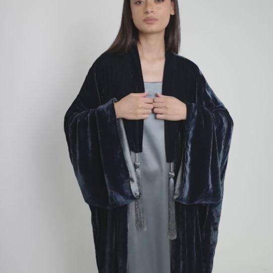 A two-piece set: a sleek inner dress layered under a fluid velvet bisht with tassel ties for a rich, elegant finish.