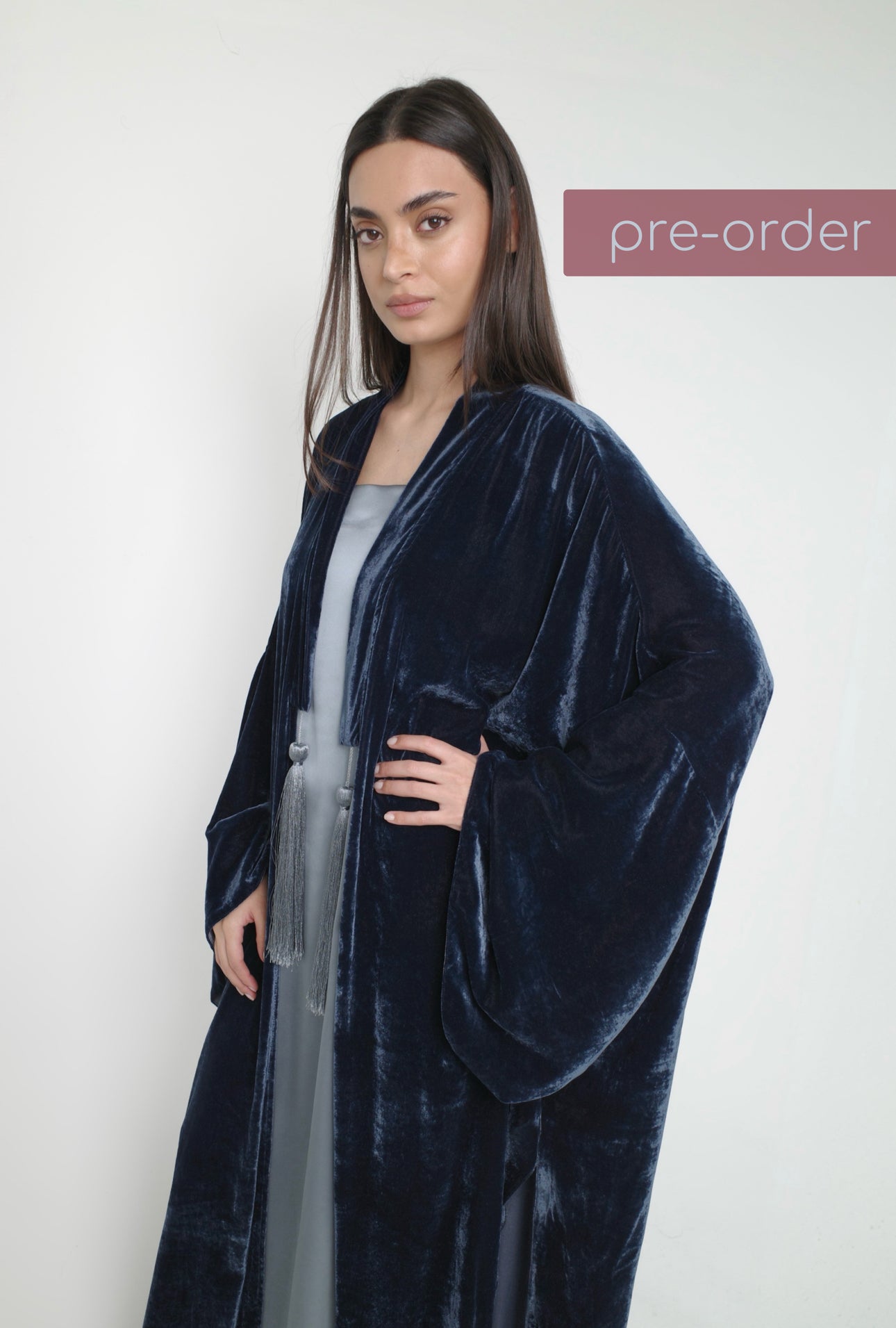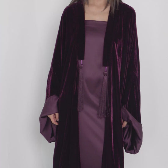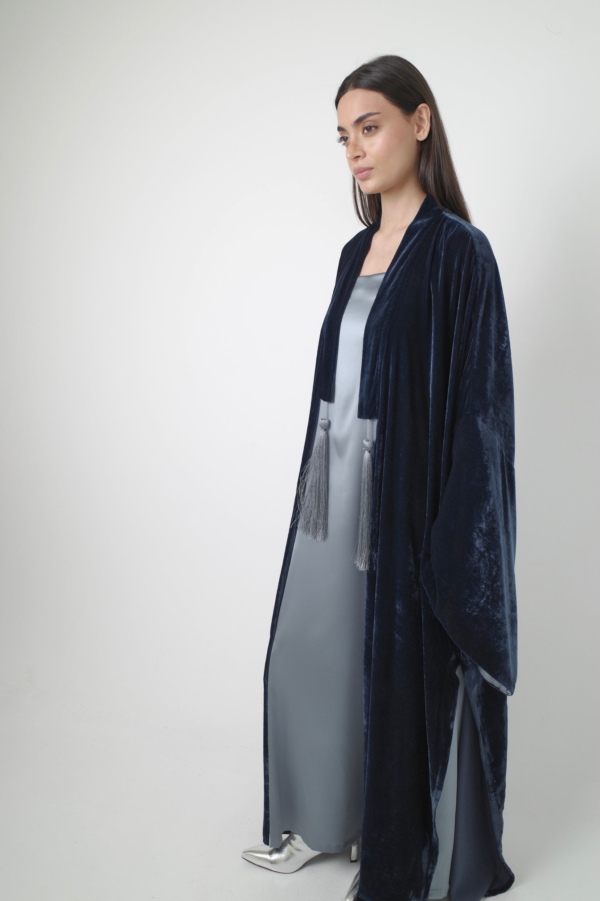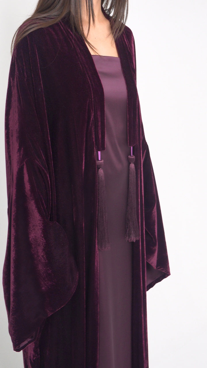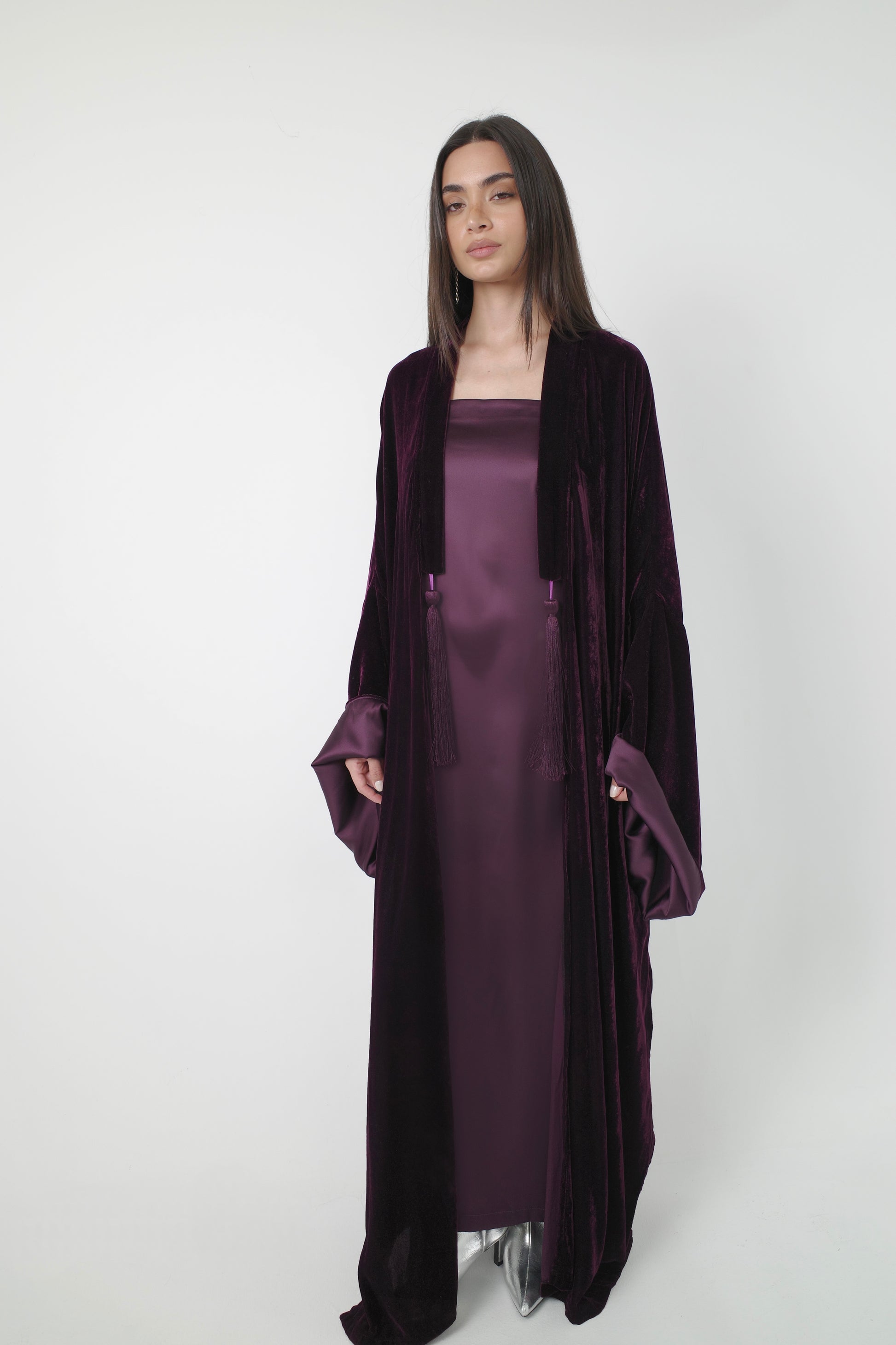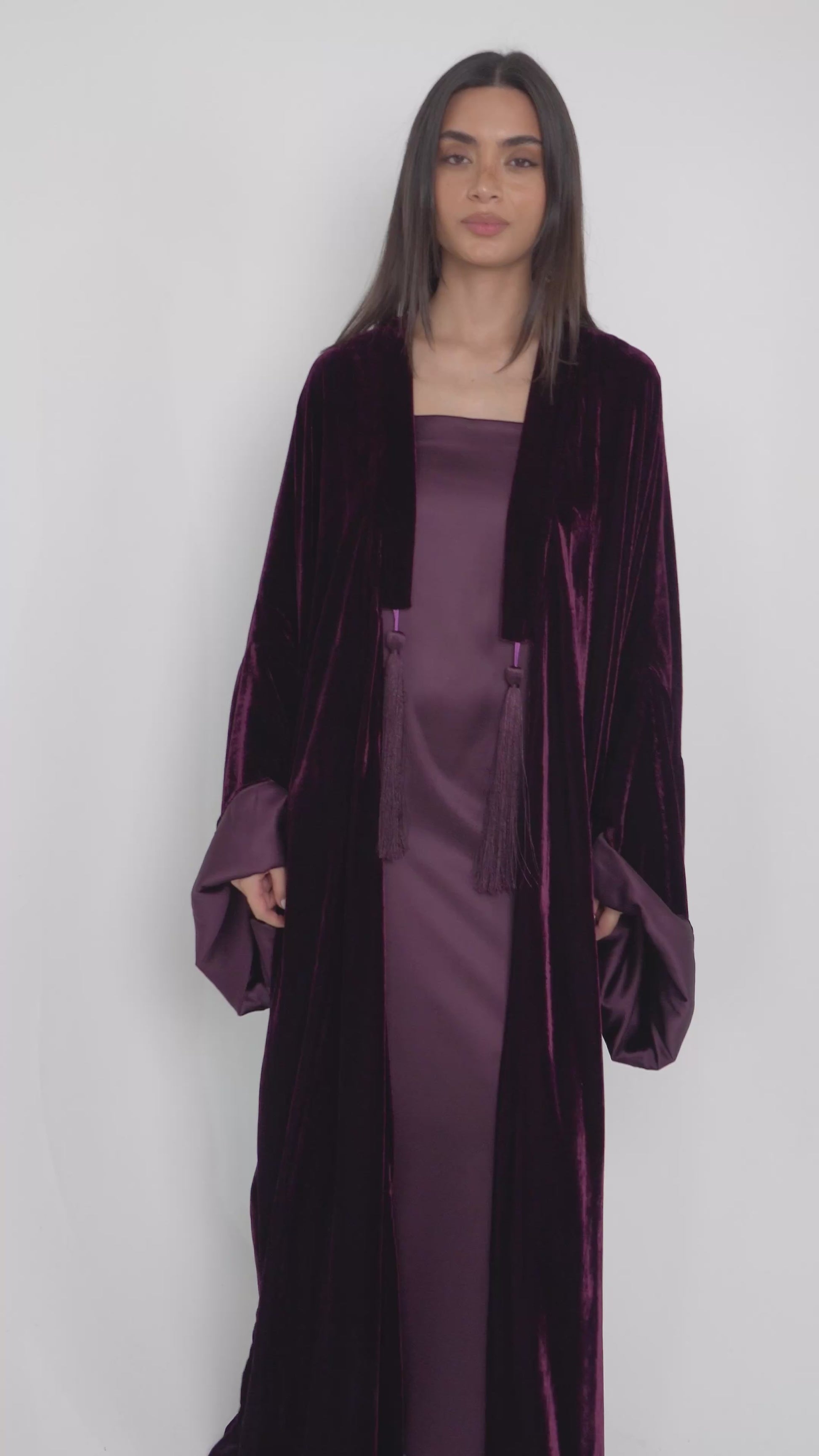 A two-piece set: a sleek inner dress layered under a fluid velvet bisht with tassel ties for a rich, elegant finish.