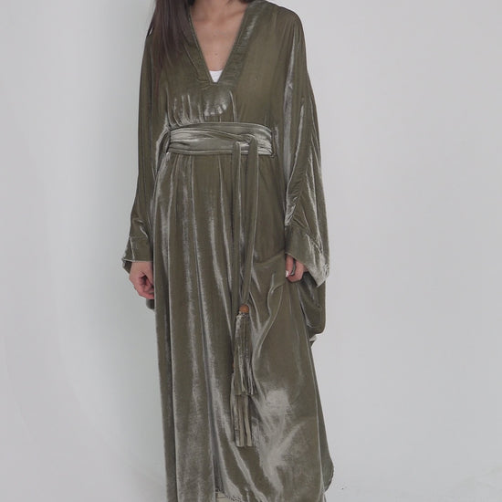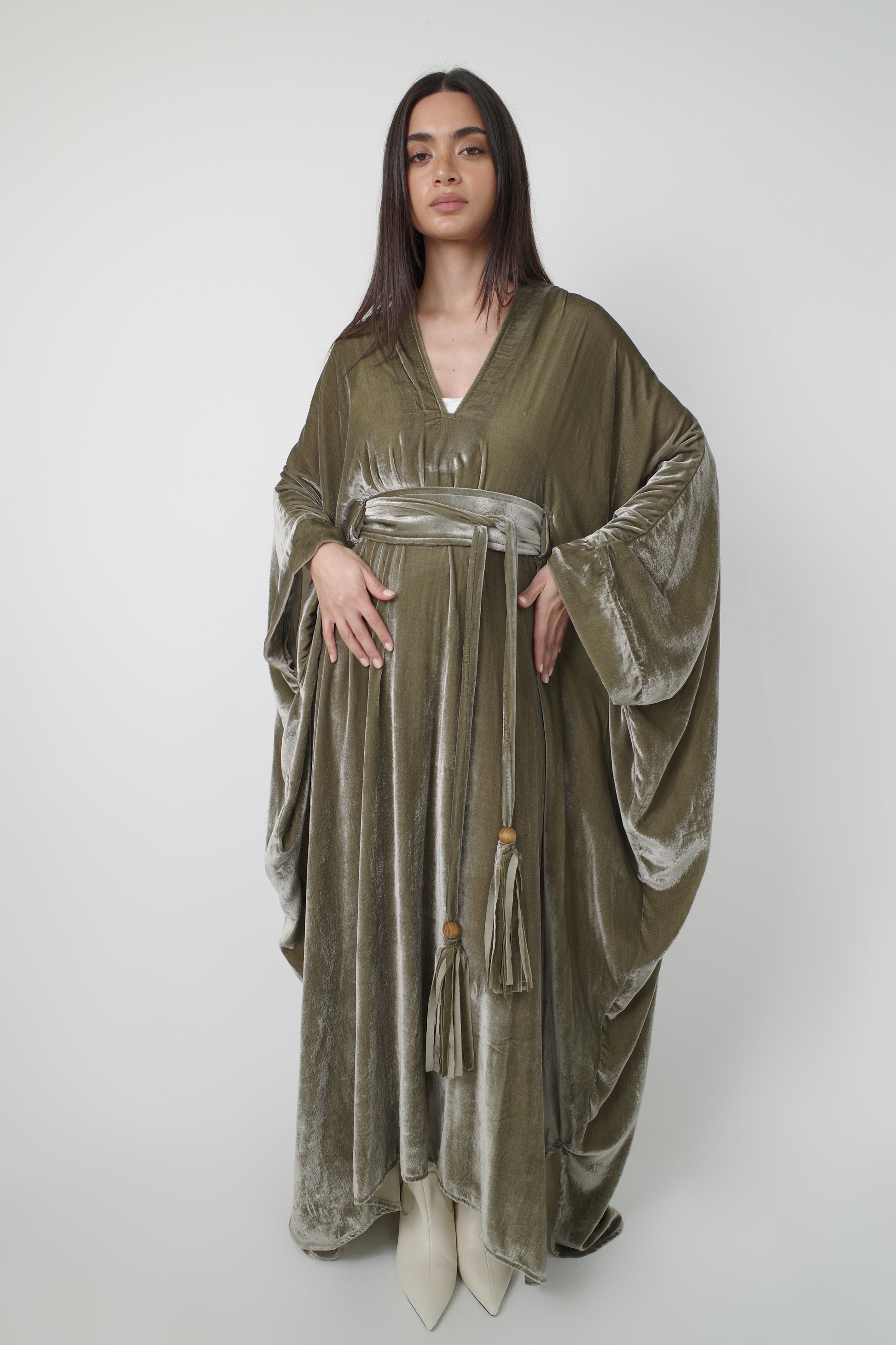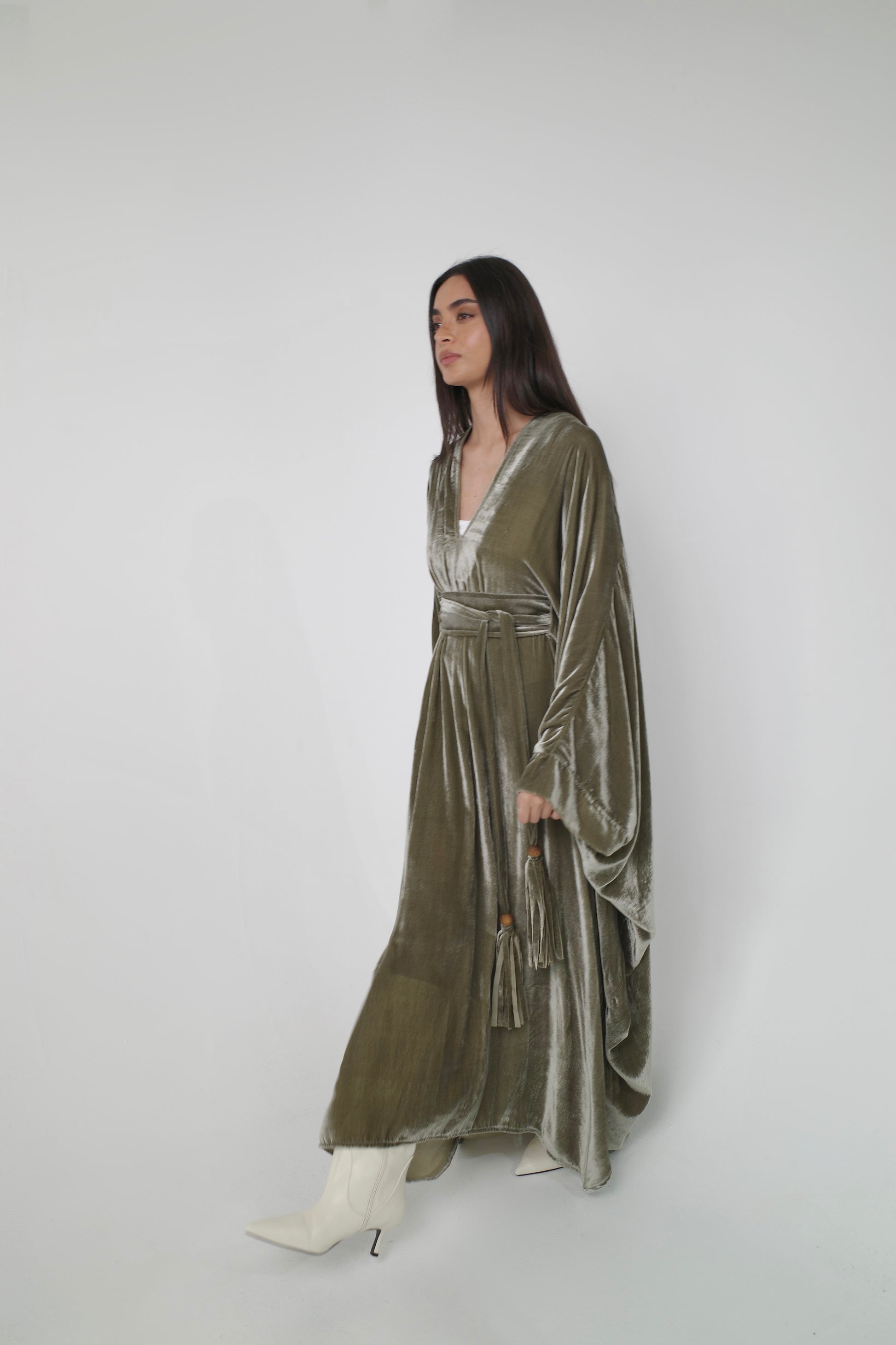 A fluid velvet kaftan in soft sage tones, designed with a wide belt and velvet tassel ties—perfect for Ramadan nights.