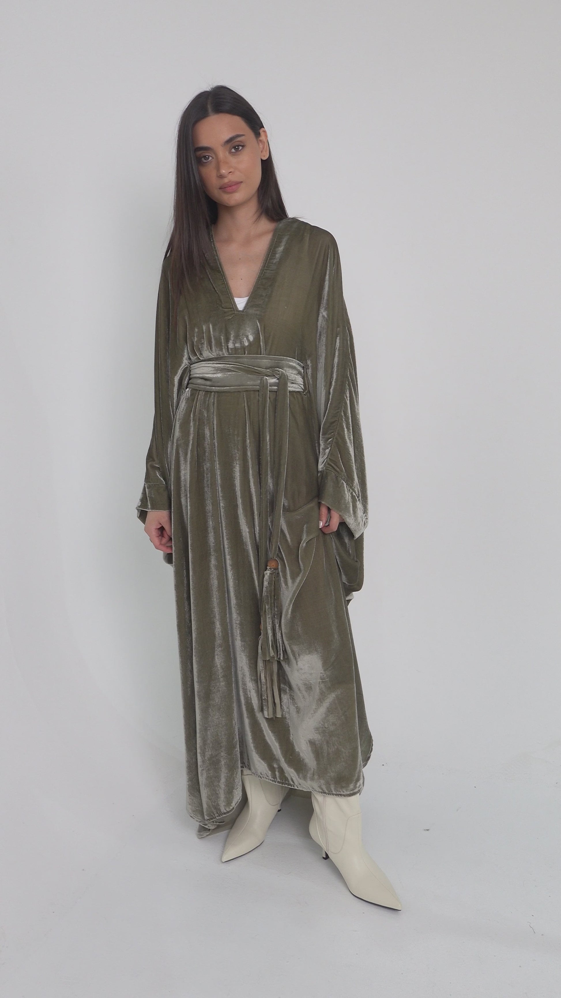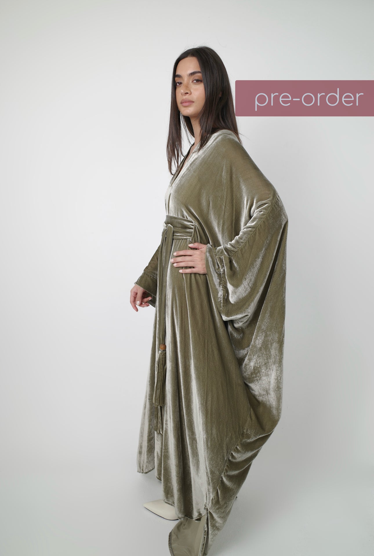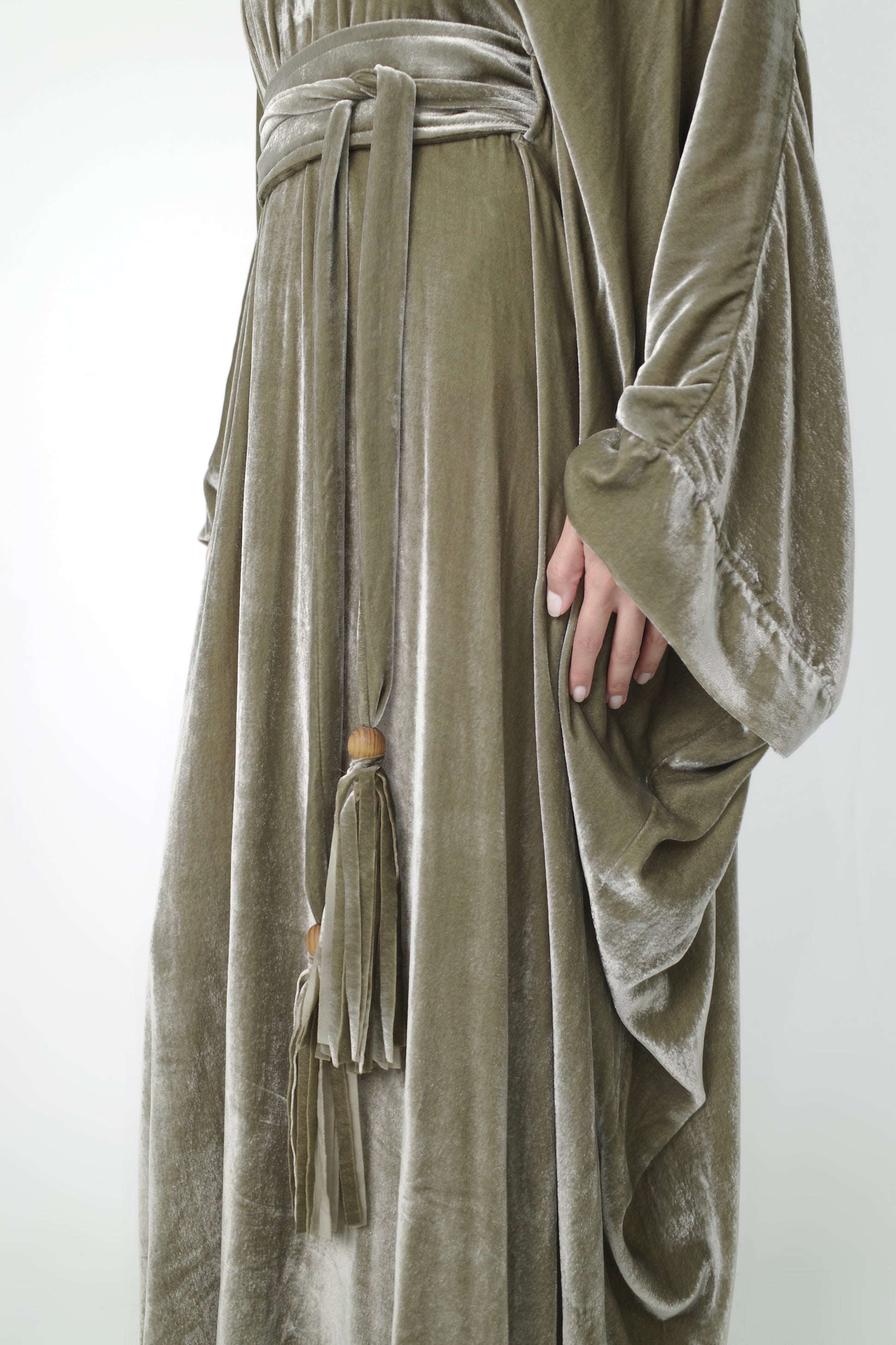 A fluid velvet kaftan in soft sage tones, designed with a wide belt and velvet tassel ties—perfect for Ramadan nights.