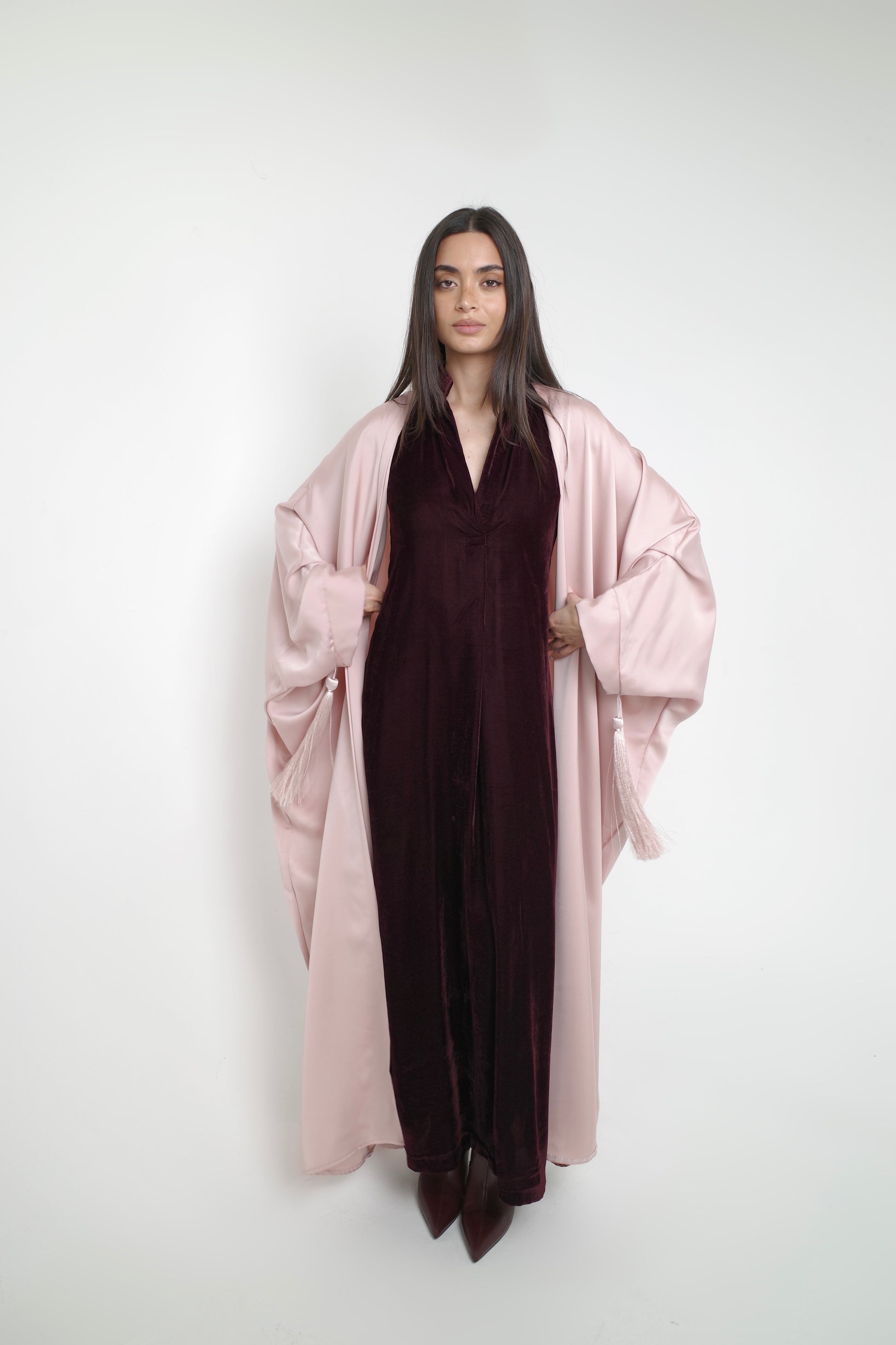A two-piece set featuring a sleek velvet inner dress layered under a flowing blush bisht with tassel ties—soft, elegant, and effortlessly refined.
